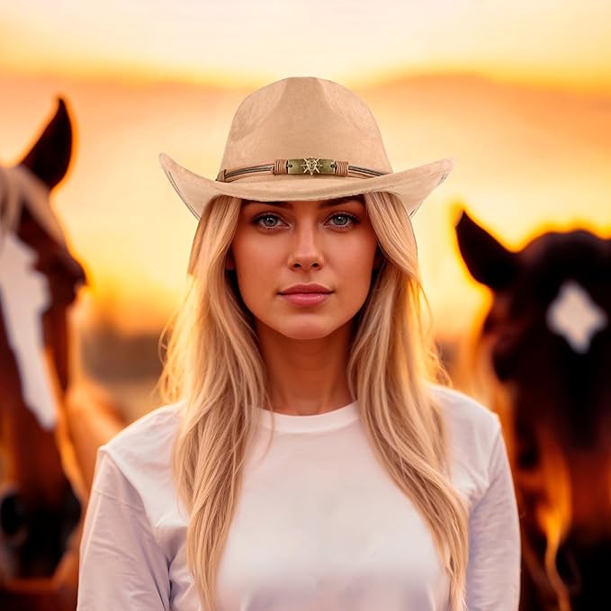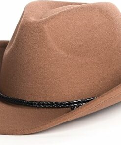 - Classic Western Design: The Western Cowboy Hat features a timeless camel-colored faux suede finish, adorned with a stylish metal skull braided band, making it a perfect accessory for anyone looking to elevate their cowboy attire.